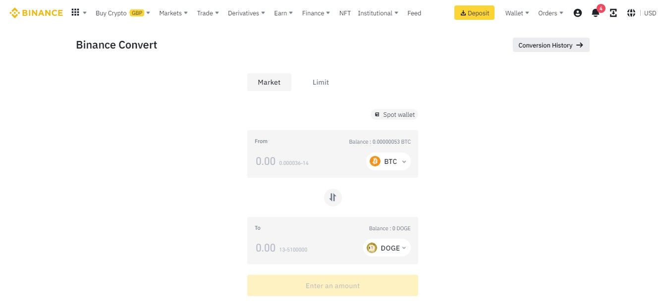 There are two ways to convert your crypto to DOGE: Market order or Limit order.