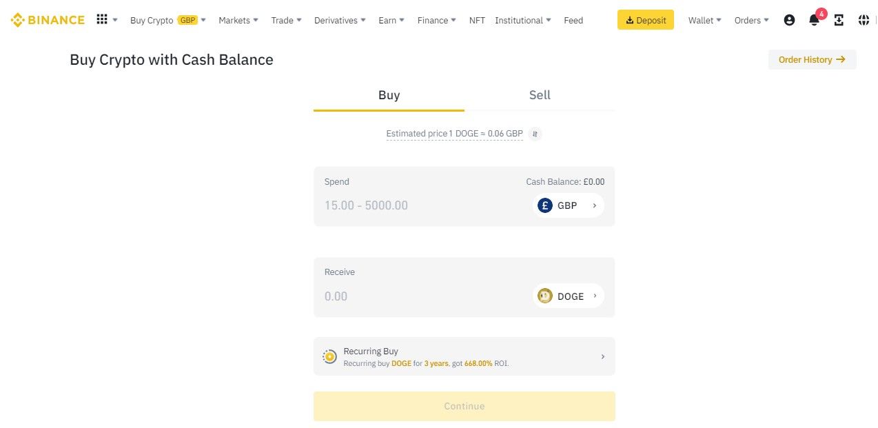 Congrats! You have now bought DOGE by funding your Binance account with fiat currency and using a Binance Cash balance.