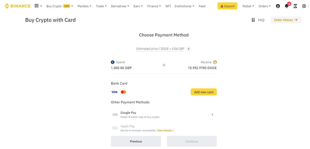 Congrats! You have now bought Dogecoin on Binance using your preferred Google or Apple pay.