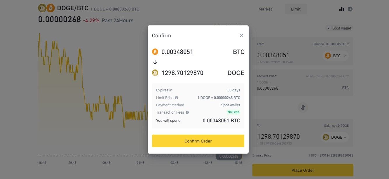 The above screenshot shows an example of placing a limit order to buy Dogecoin using BNB. You can click on the bars icon next to the limit button to display the price chart of your selected crypto convert pair. Click on Confirm order to get 900 DOGE tokens into your account.