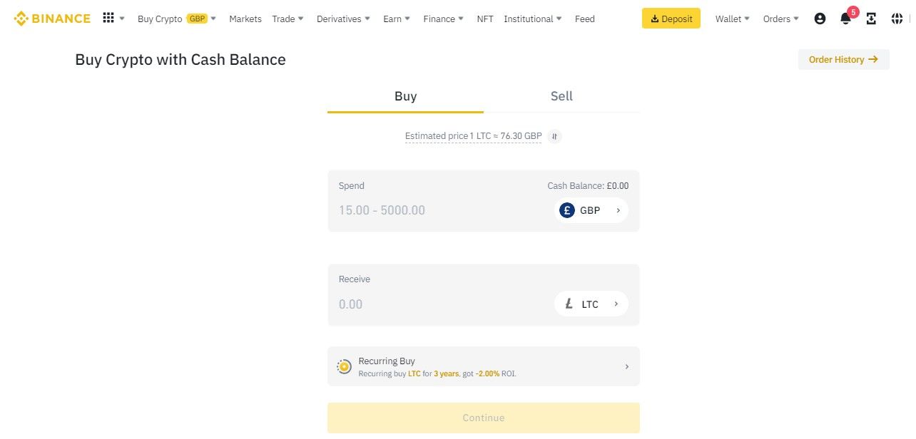 Congrats! You have now bought LTC by funding your Binance account with fiat currency and using a Binance Cash balance.