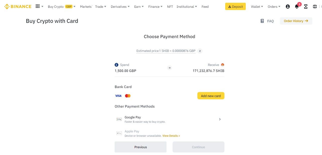 In the payment method section, if you just created your Binance account, add the card details you will use to purchase SHIB.