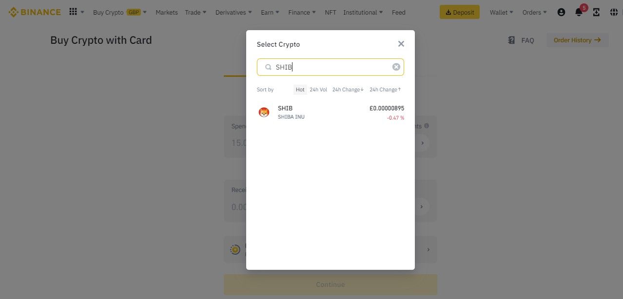 Choose a cryptocurrency exchange that supports SHIB trading. Binance is one of the best places to buy SHIB in the UK.