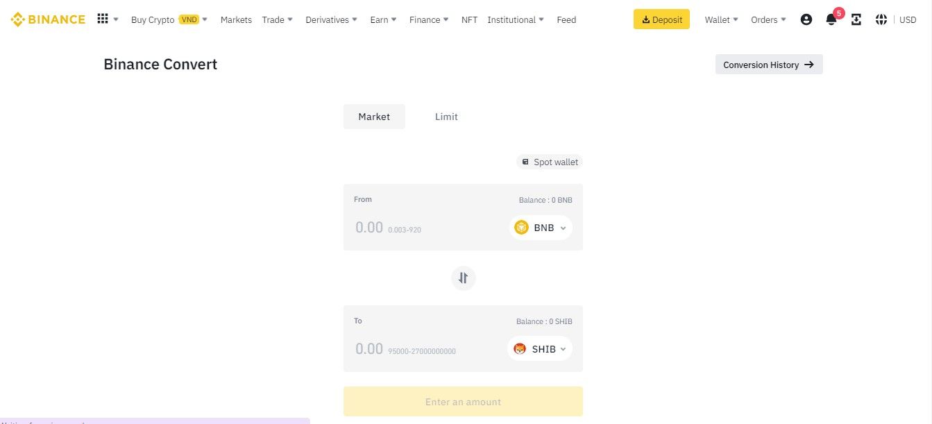 There are two ways to convert your crypto to SHIB: Market order or Limit order.