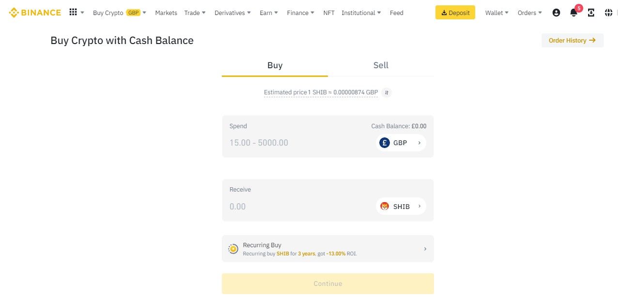 Congrats! You have now bought SHIB by funding your Binance account with fiat currency and using a Binance Cash balance.