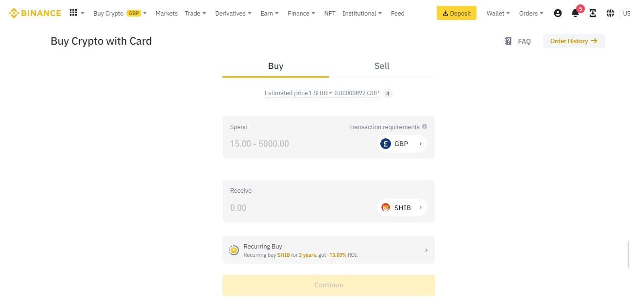 2. Select the fiat currency according to your country and then select Shiba Inu crypto to buy from the list. Enter the amount and click Continue.