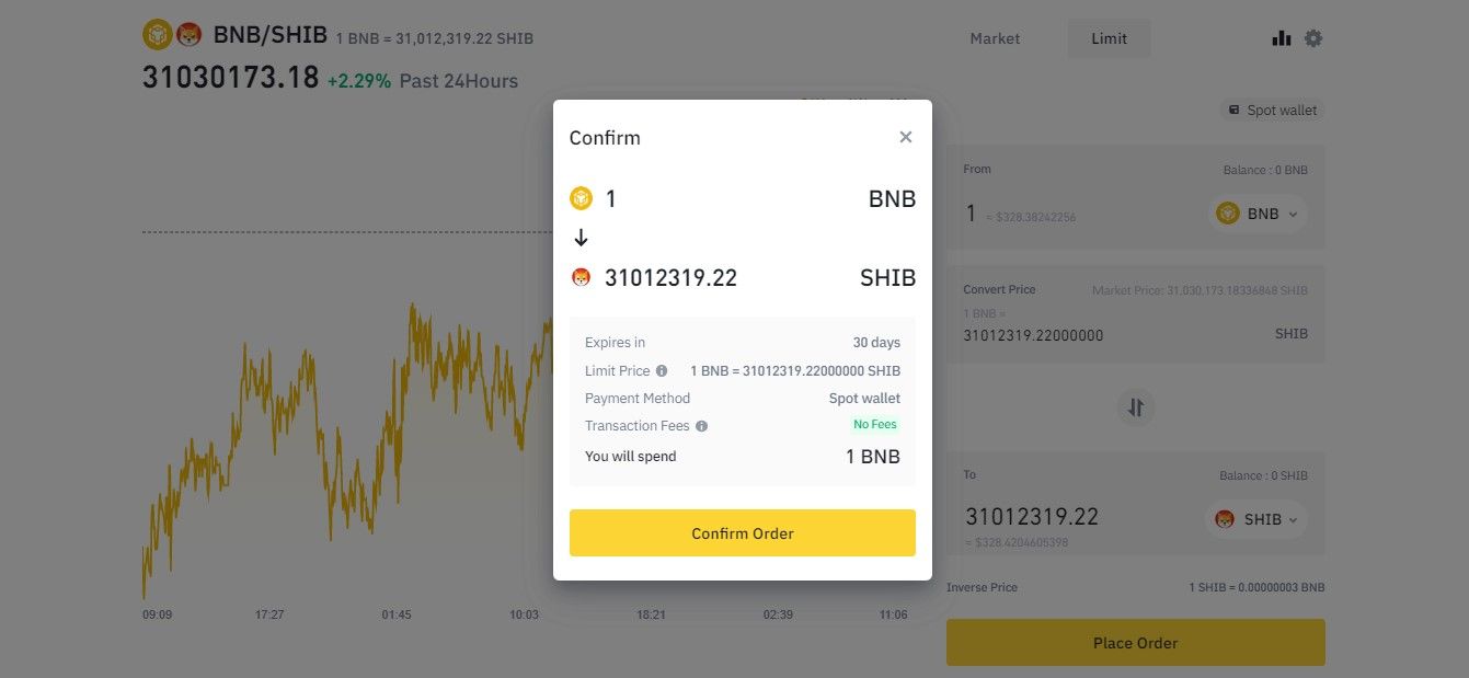The above screenshot shows an example of placing a limit order to buy Shiba Inu using BNB. You can click on the bars icon next to the limit button to display the price chart of your selected crypto convert pair. Click on Confirm order to get 900 SHIB tokens into your account.