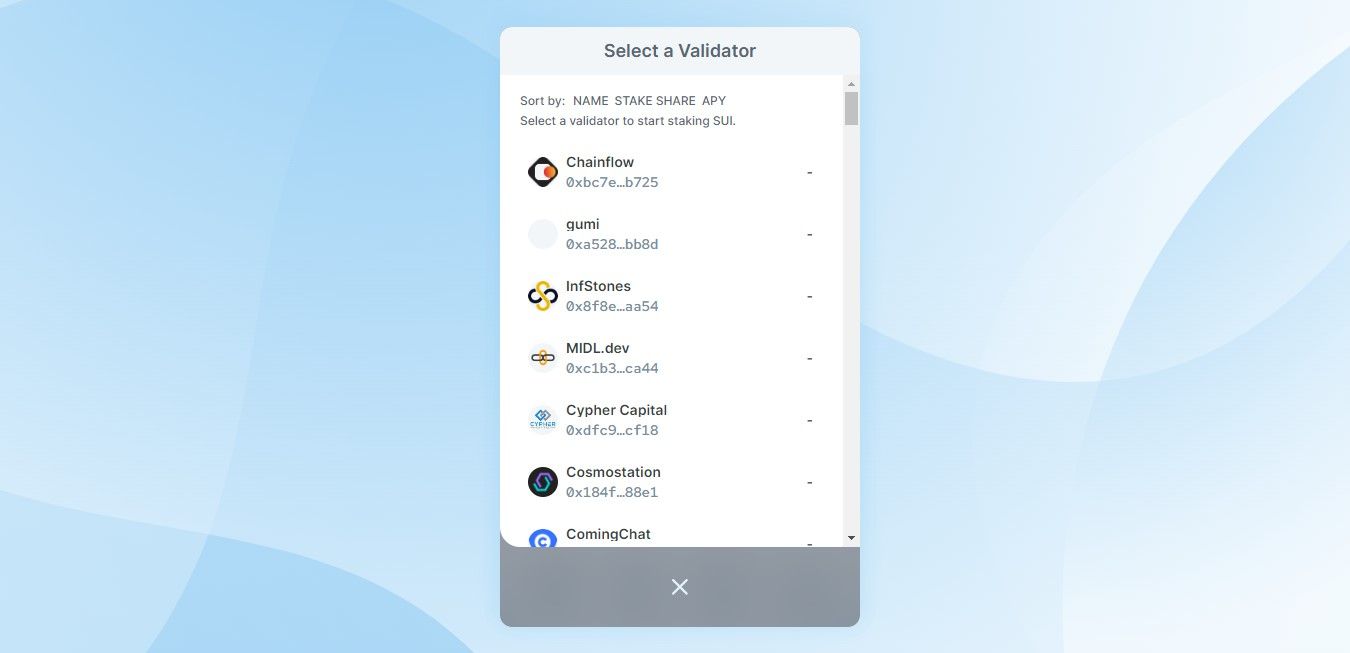 - You can sort the validator list by name, stake share, or APY based on your priority.