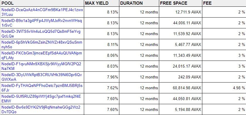 The best Avalanche validators are chosen based on max yield, free space, APY, and commission fees. The current annual yield on staking Avalanche is around 8%, already minus delegation fee.